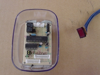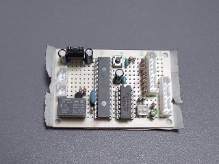 メイン基板 基板上の主な部品はCPU、三端子レギュレータ、シュミットトリガ、リレー、LEDぐらいです。 高機能なワンチップマイコンのおかげでたったこれだけのパーツで済ますことが出来ました。 |