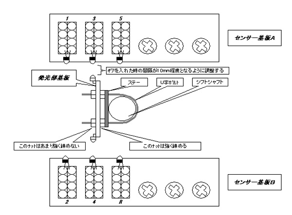 発光部基板 フォトLEDが実装されている基板です。シフトシャフトに金具を使用して取り付けます。取り付け方法は 下記図を参考にして下さい |