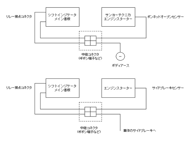 エンジンスターターセキュリティについて メイン基板上にリレーを実装して、起動時にギアがニュートラルであればリレーをONにしています。 コネクタからハーネスは2本出ていて、リレーがONになるとそれぞれが導通状態になります。エンジンスターターの種類により 配線が異なると思います。例えばサンヨーテクニカの製品の場合は標準でボンネットオープン検知機能があり、アース導通した 状態であればエンジンが掛かるので、この場合ハーネスの片側はアース、もう片方はエンジンスターターへ接続します。 サイドブレーキ検知しかない機種の場合は、サイドブレーキへの配線に直列に割り込ませるように配線して下さい。 電源を入れてからリレーがONになるまでの時間は約100msです。うまくいかないときは連絡して下さい。プログラムを修正して 時間を調整します。 |