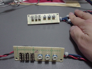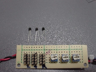 センサー部基板 各シフト位置を検知するための基板です。フォト・トランジスタと可変抵抗(ボリューム)が実装されます。 フォト・トランジスタはICソケットに実装します。ICピン配置などは下記図を参考にして下さい。 |